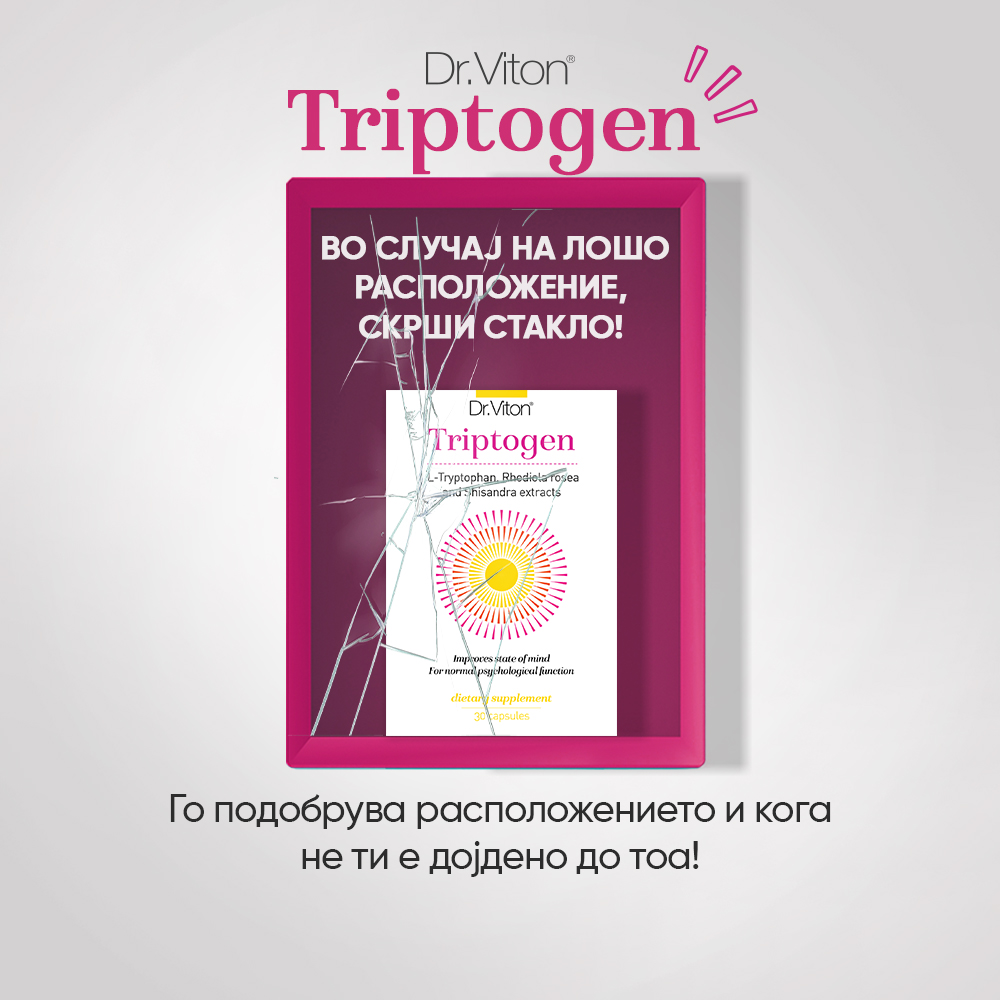 Triptogen на Dr. Viton, ја носи врвната формула за подобрување на расположението, намалување на анксиозноста и зголемување на добросостојбата. Покрај Л-триптофан, содржи и родиола (екстракт од корен – адаптоген кој го штити телото од стрес), шисандра, магнезиум, биотин, витамин Б6, фолна и пантотенска киселина.