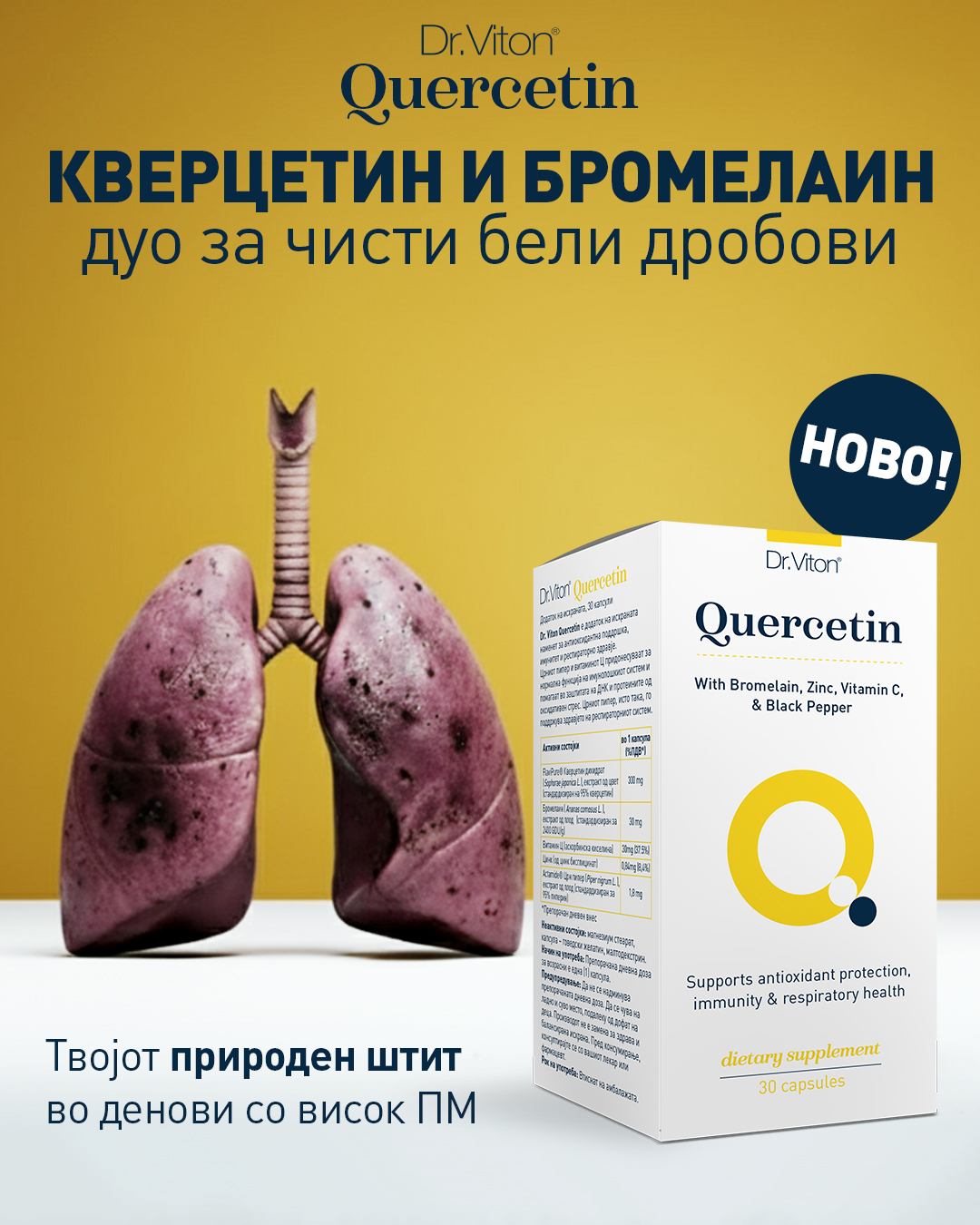 Dr. Viton Quercetin – засилена формула со FlaviPure® кверцетин, бромелаин, витамин Ц, цинк и пиперин, е достапен како дневна природна поддршка за респираторно здравје и имунитет.
