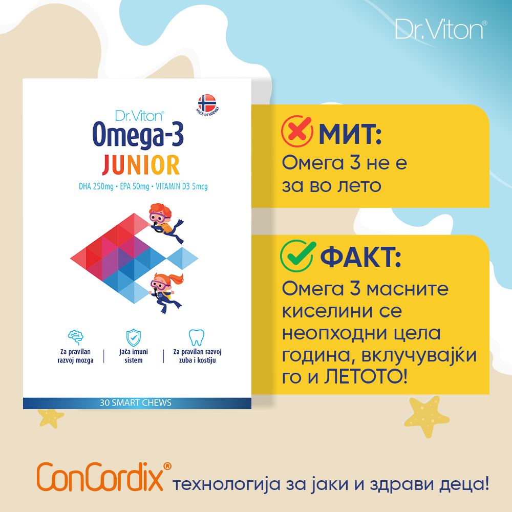 За мирно и здраво лето, без плачки одбери Dr. Viton Omega – 3 Junior, меки таблети за џвакање кои содржат оптимална доза на омега-3 масни киселини (еикозапентаенонска – ЕПА и докосахаексаеноична киселина – ДХА) и витамин Д3.